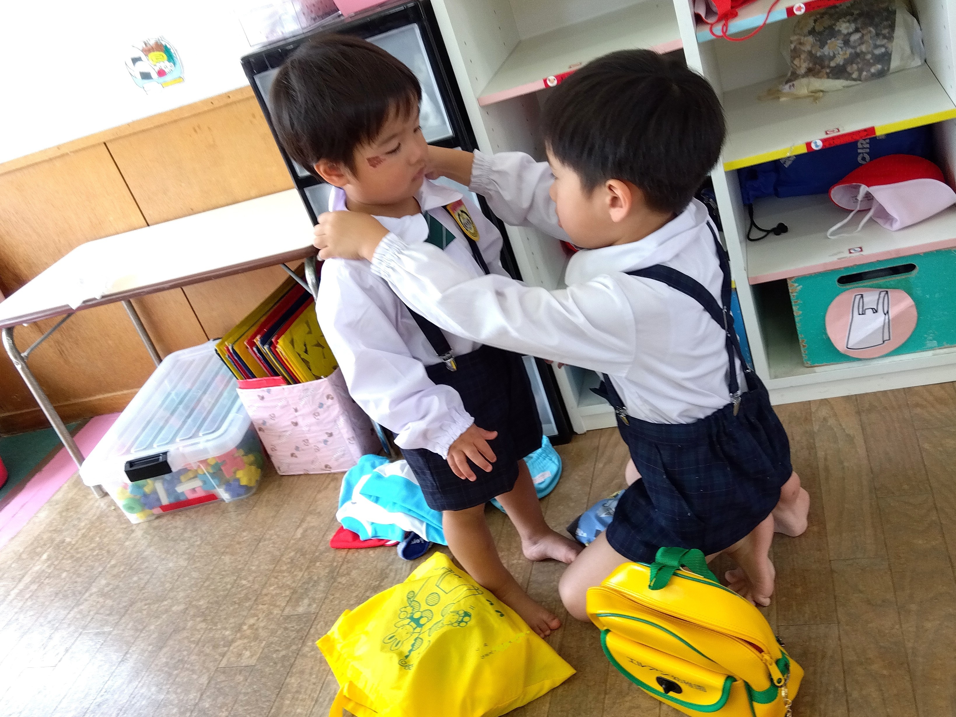 この日は、きらきらランド(満3歳児クラス)のお友達の、着替えをお手伝い。