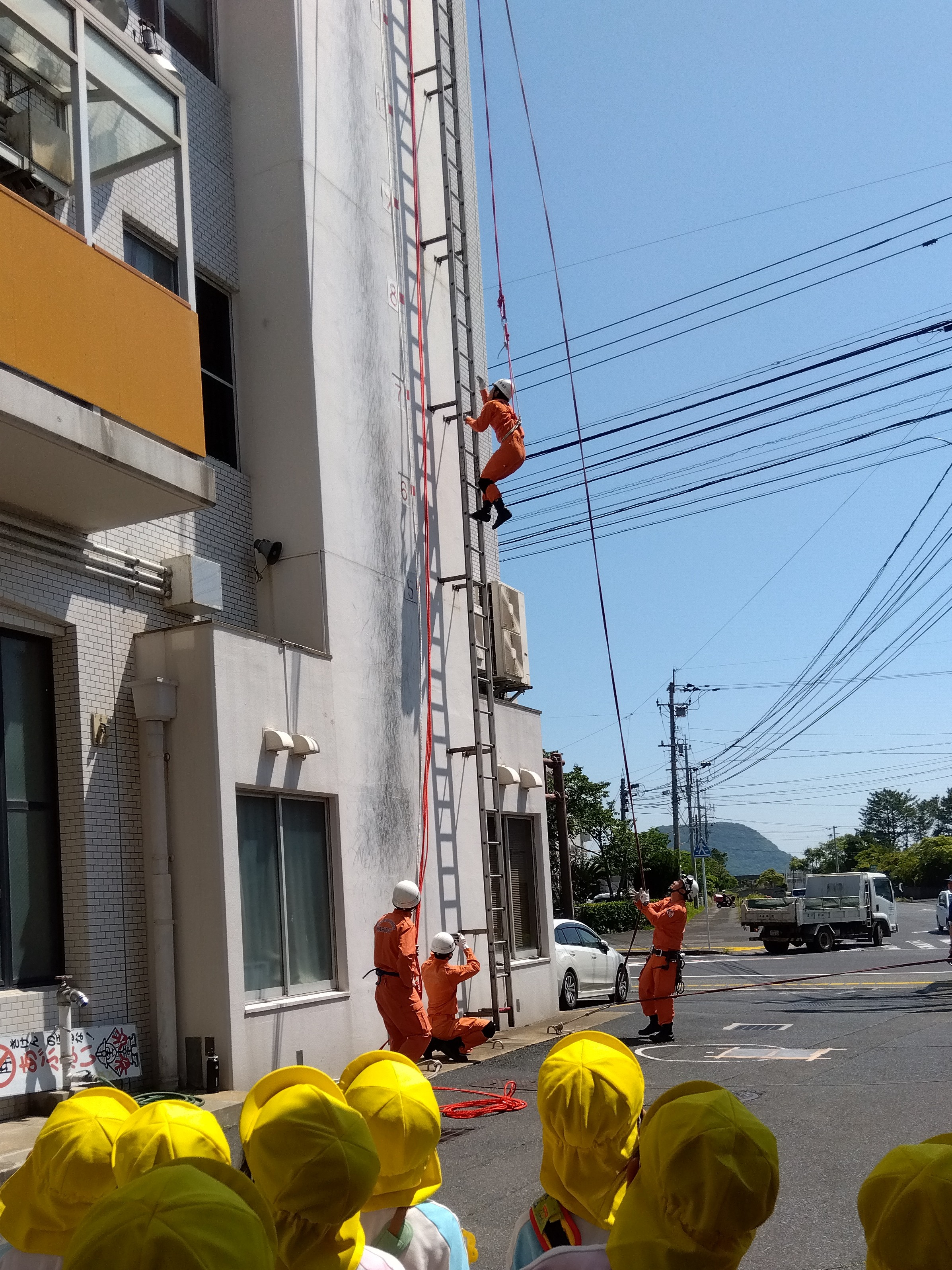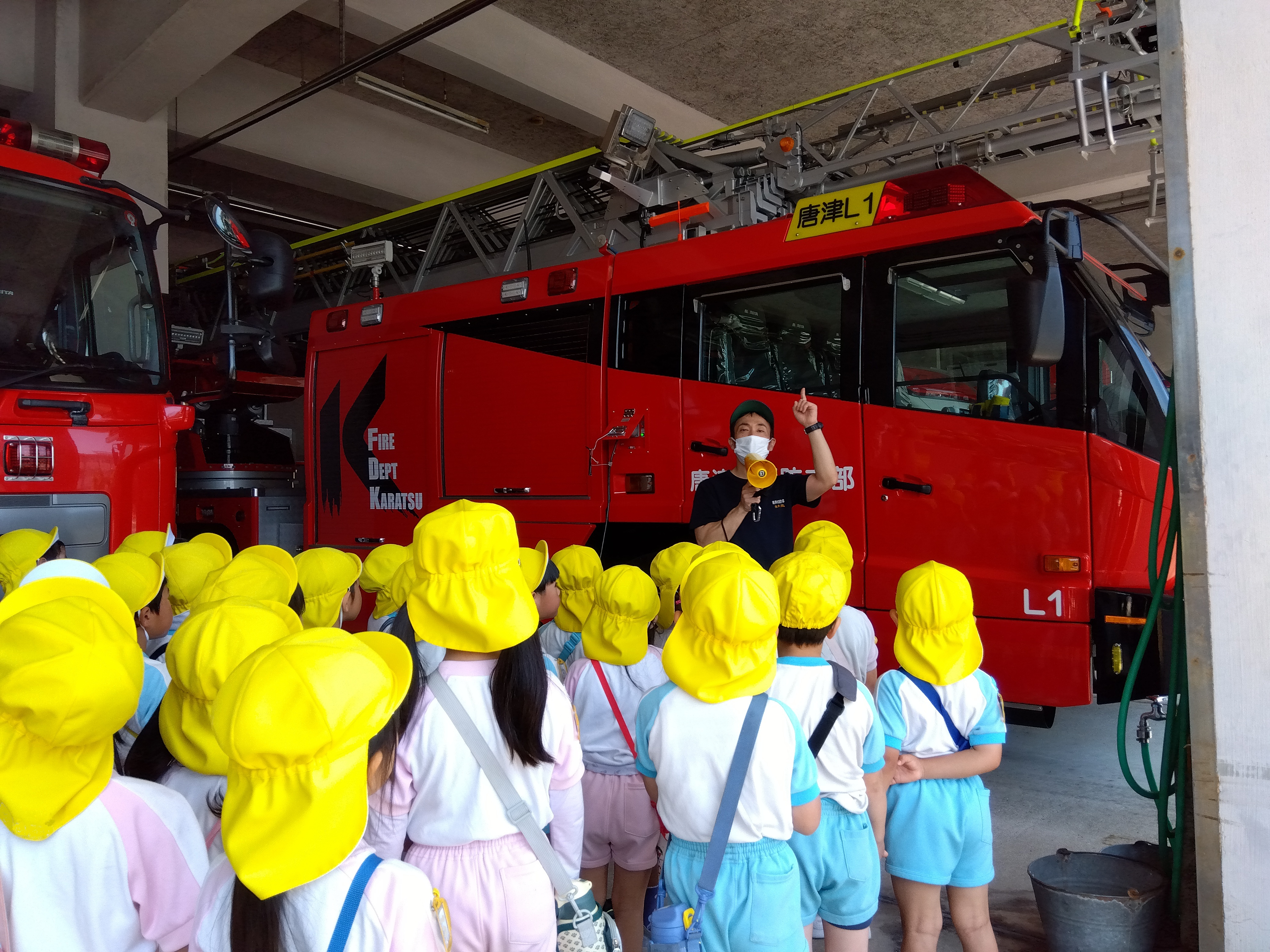 【消防署見学】年長児が唐津消防署へ見学に行ってきました。色々な種類の消防車両や指令センター、仮眠室などを見せてもらい、救助訓練の様子も見学させてもらいました。子ども達からは「すごーい!」「格好良い!」と、大きな歓声が上がっていました。消防士さんの一生懸命な、格好良い姿を見て、大きくなったら消防士さんになりたい子、続出です。頼もしい!将来が楽しみですね。