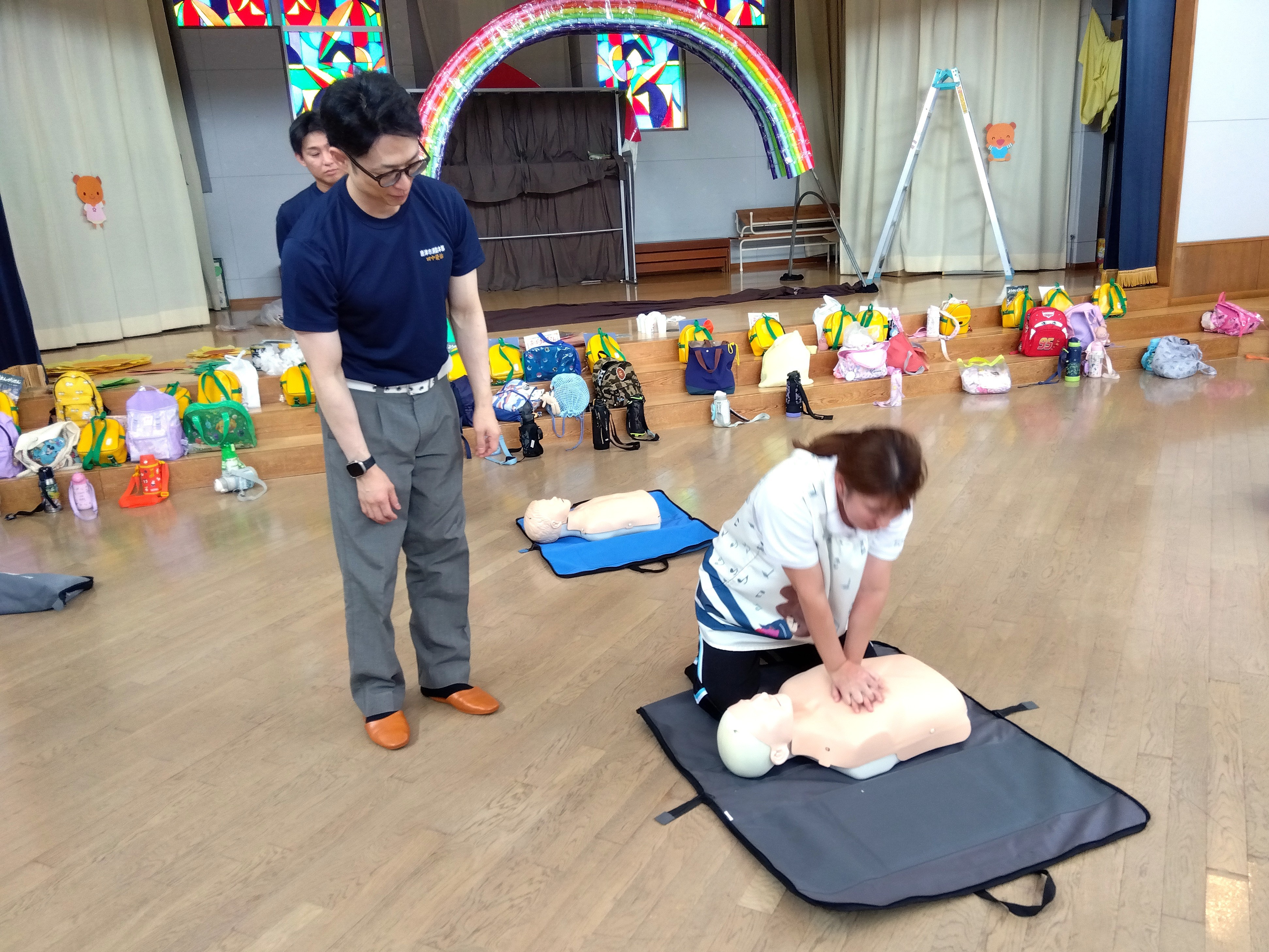 救急救命講習(職員研修)唐津市消防本部より、救急救命士さんに来ていただき、職員全員で、心肺蘇生法とAED(自動体外式除細動器)の使用方法を確認しました。毎年行っている研修で、万が一の事態に備え、慌てず行動する為には、色々な場面を想定し繰り返しシミュレーションする事と、常に新しい情報にアップデートしてく事が大切だと考えています。