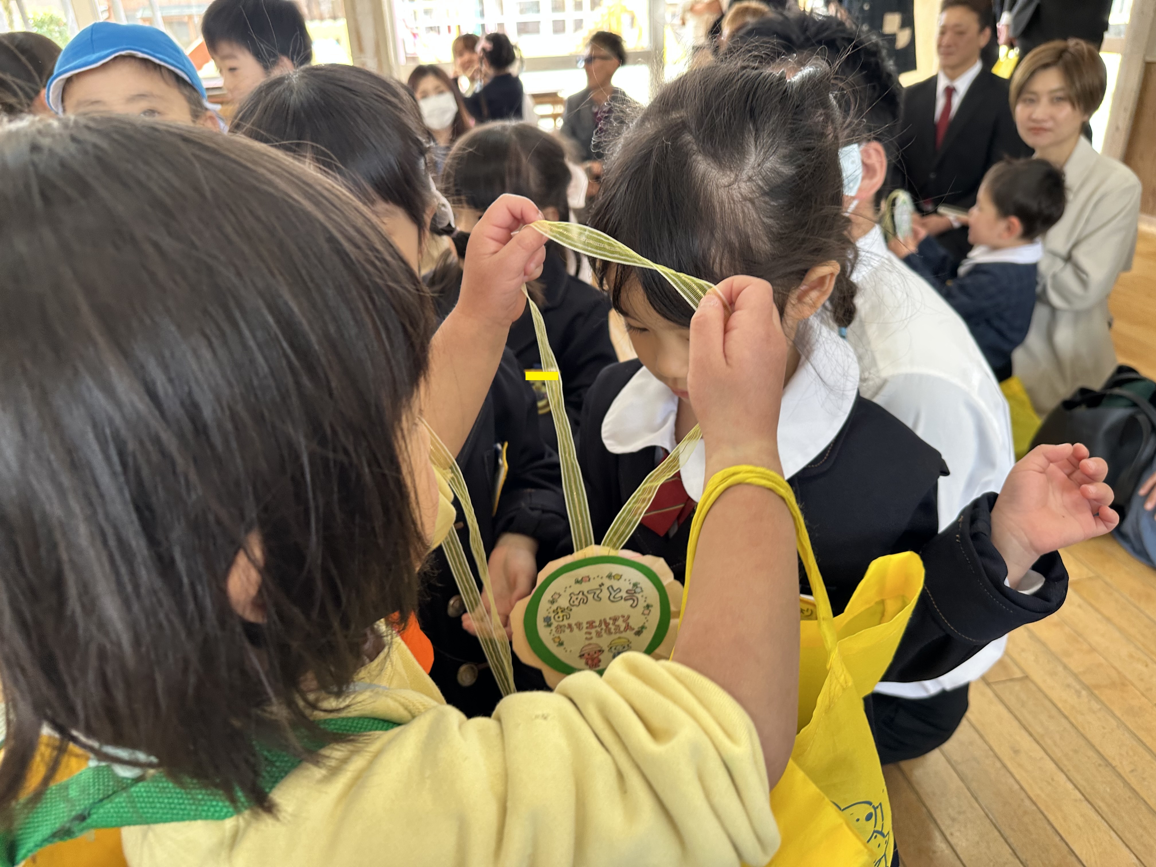 なんと、年中・年長の、お兄さん・お姉さんが『これからよろしくね!いっぱい遊ぼうね!』とプレゼントのメダルを一人ひとりにくれました。
