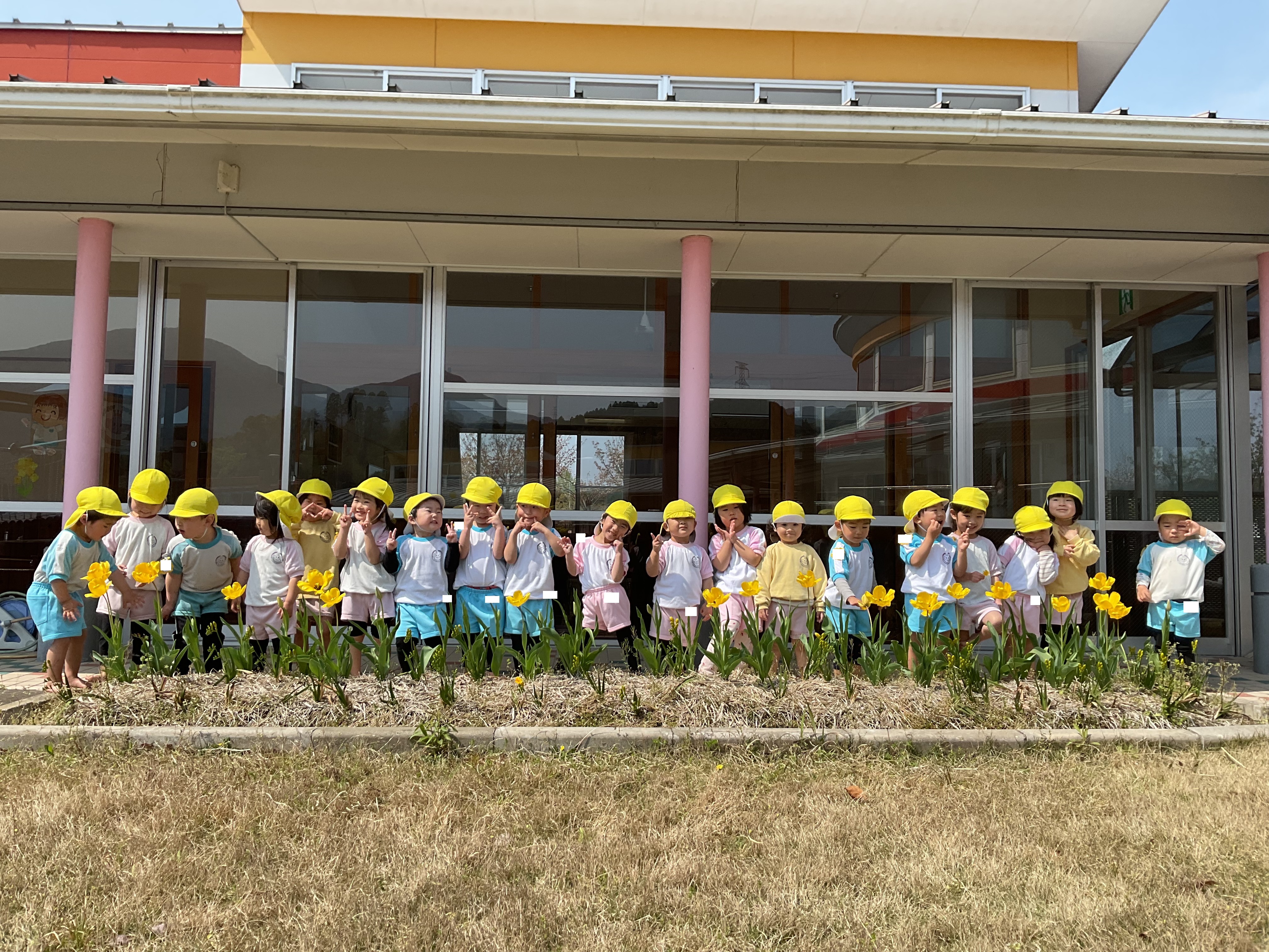 例年よりちょっと遅咲きのチューリップが見ごろを迎え、黄色帽子のこすもす組さん(年少)が記念撮影です。