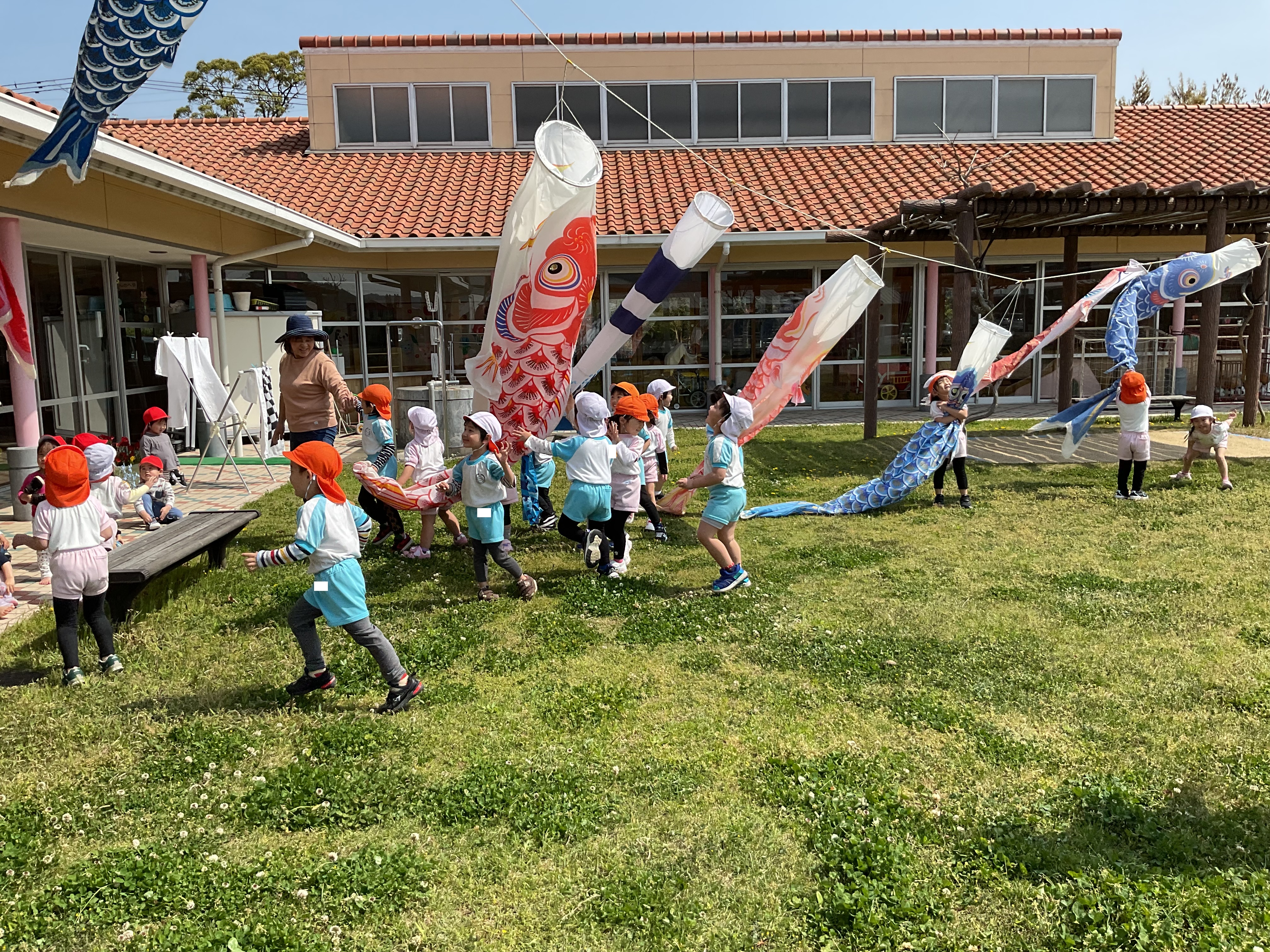 にこにこ園舎に鯉のぼりが泳いでいます。