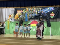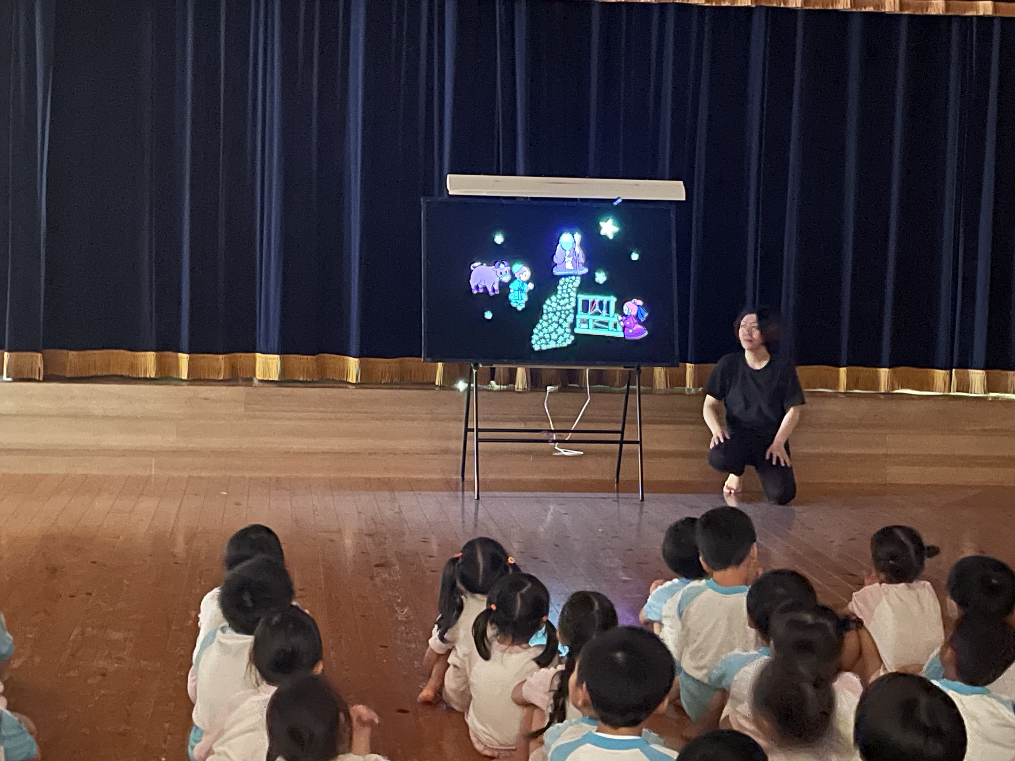 ホールを暗くし、ブラックパネルシアターで七夕の由来を知りました。