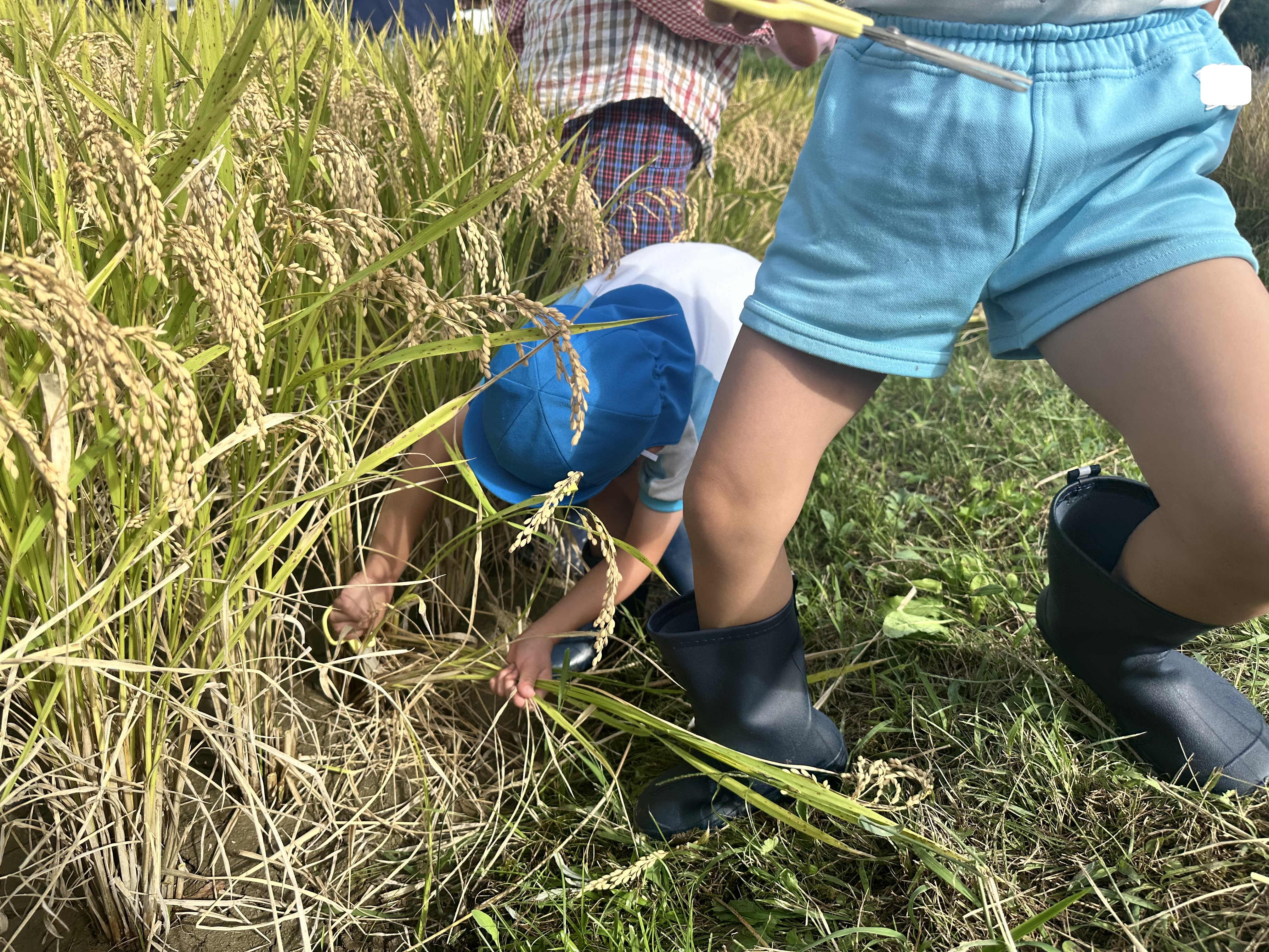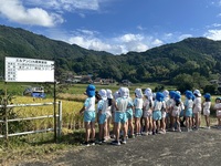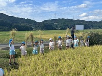 【稲刈り】 春に田植えをさせて頂いた伊岐佐地区の田んぼで、今年も年長児が稲刈りの体験をさせて頂きました。