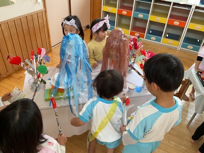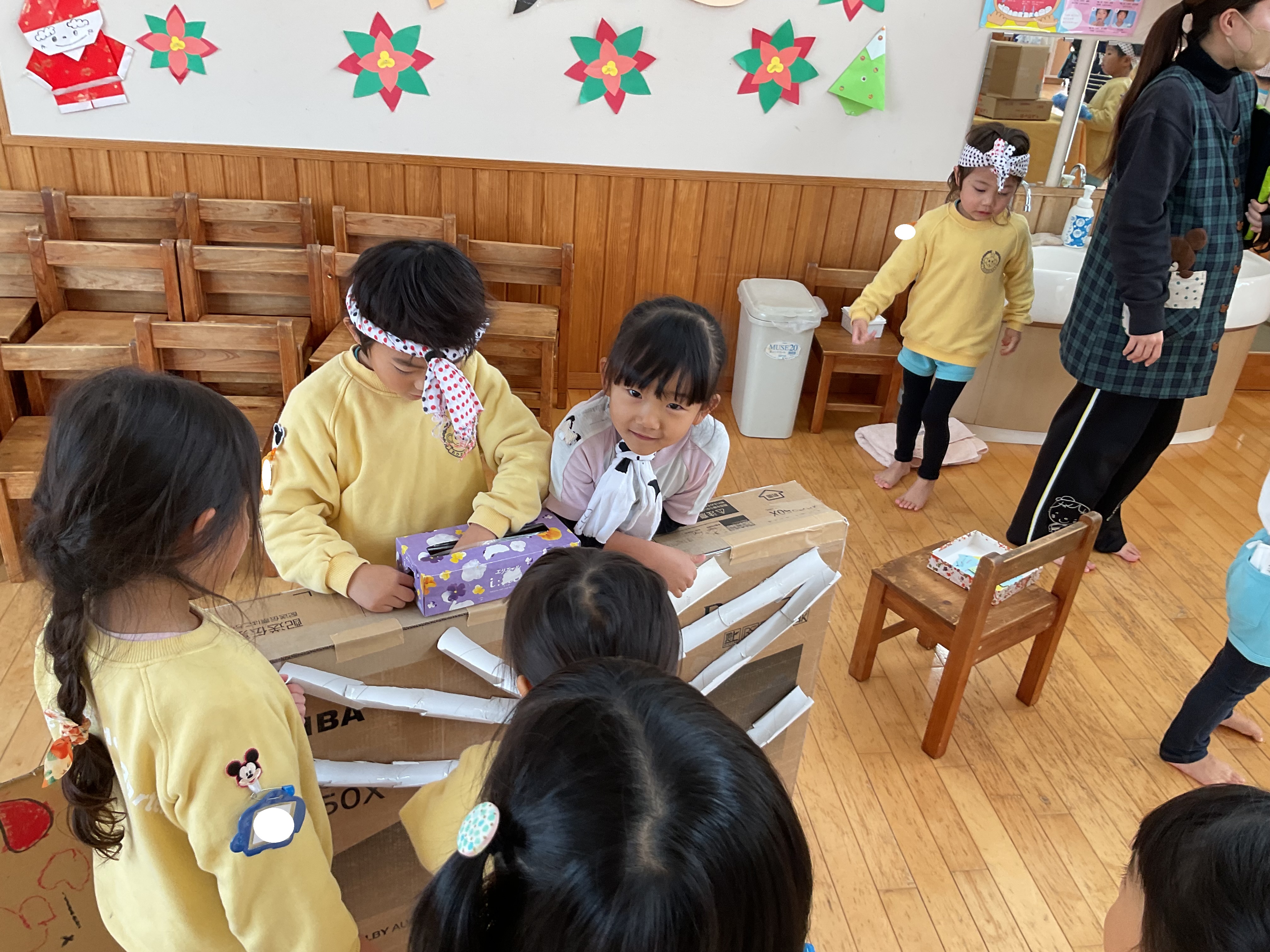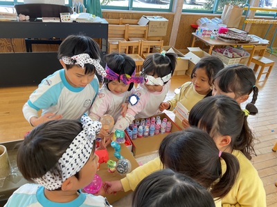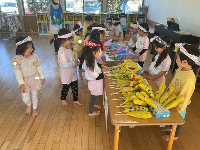 【お店屋さんごっこ】 何屋さんにするかを、各クラスで話し合い商品作りから楽しんでいた子ども達です。お休みのお友達もみんなで楽しみたい!と、何度もお店をオープンして楽しみました。