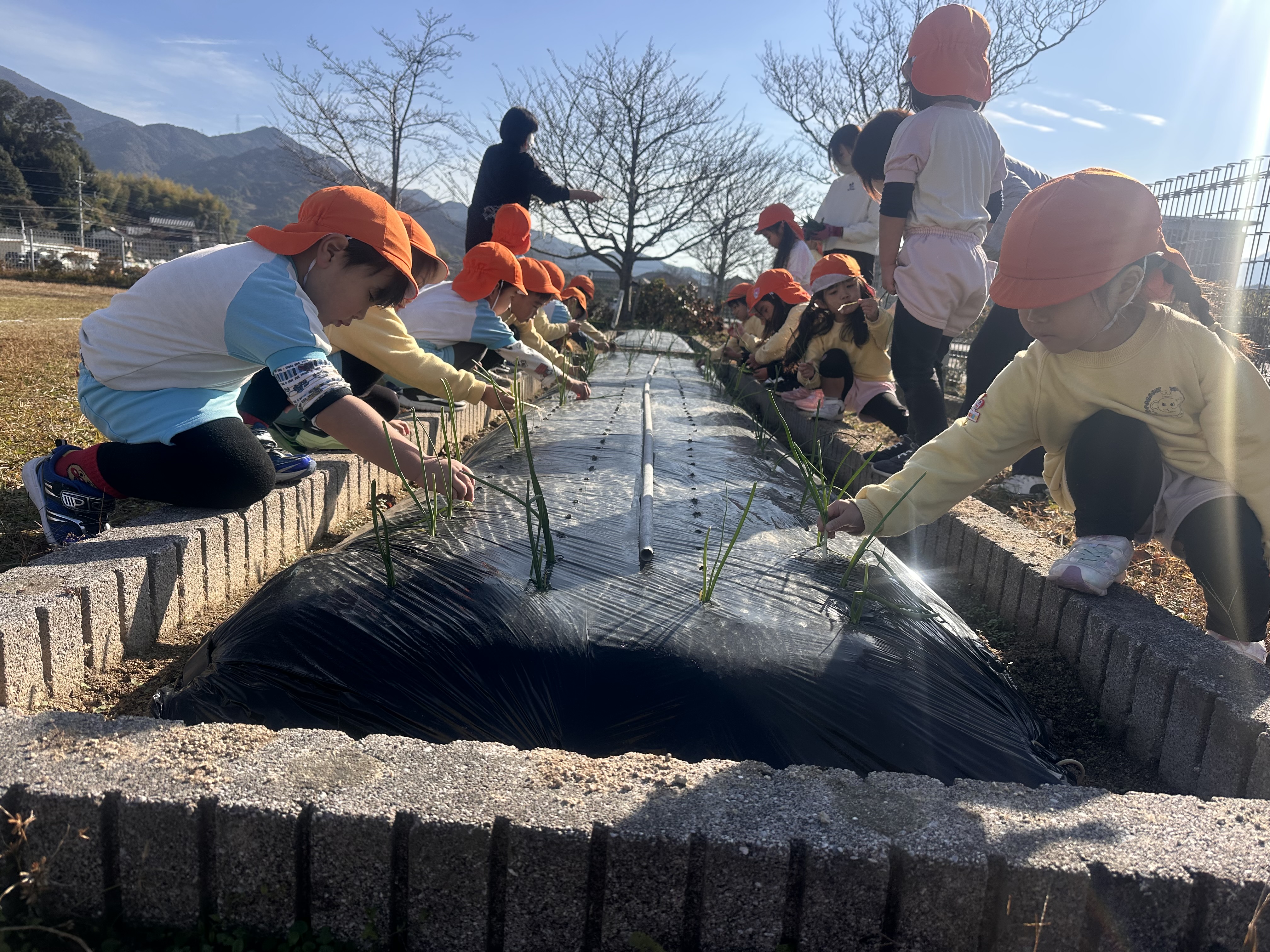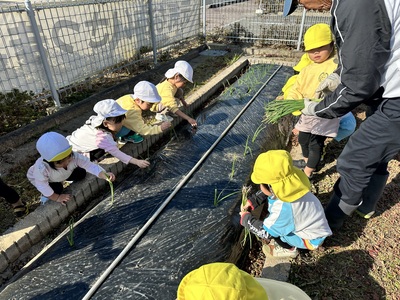 【玉ネギ苗植え】 来年の収穫に向けて、年中さん・年少さんが、玉ネギの苗植えを行いました。